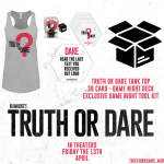 Pretty snazzy prize pack this month, if you dare to enter the contest it could all be yours. One limited edition tank top and one exclusive game night tool kit and 36 card game night deck! You can bet there are some really disturbing things on these cards, if the trailer is any indication. Oh, and they only made 200 of these decks. So, this is a VERY Limited Edition … [Read more...] about Blumhouse’s Truth or Dare Giveaway